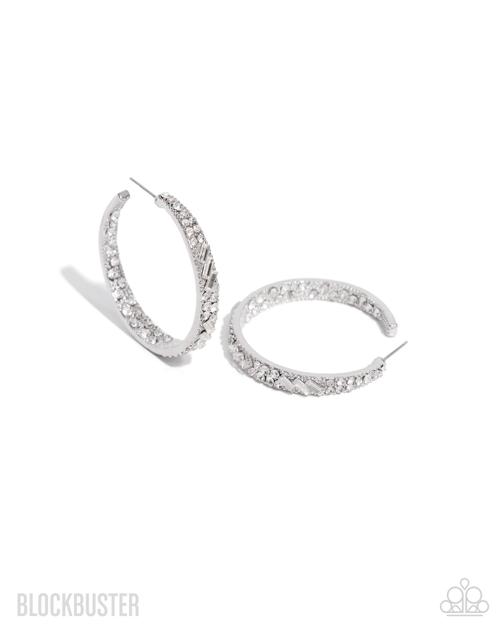 The front facing surface of a chunky silver hoop is dipped in brilliantly sparkling rhinestones while light-catching texture wraps around the back. The interior of the hoop features the opposite pattern, creating the illusion of a full hoop of blinding rhinestones. Earring attaches to a standard post fitting. Hoop measures 1 3/4" in diameter.