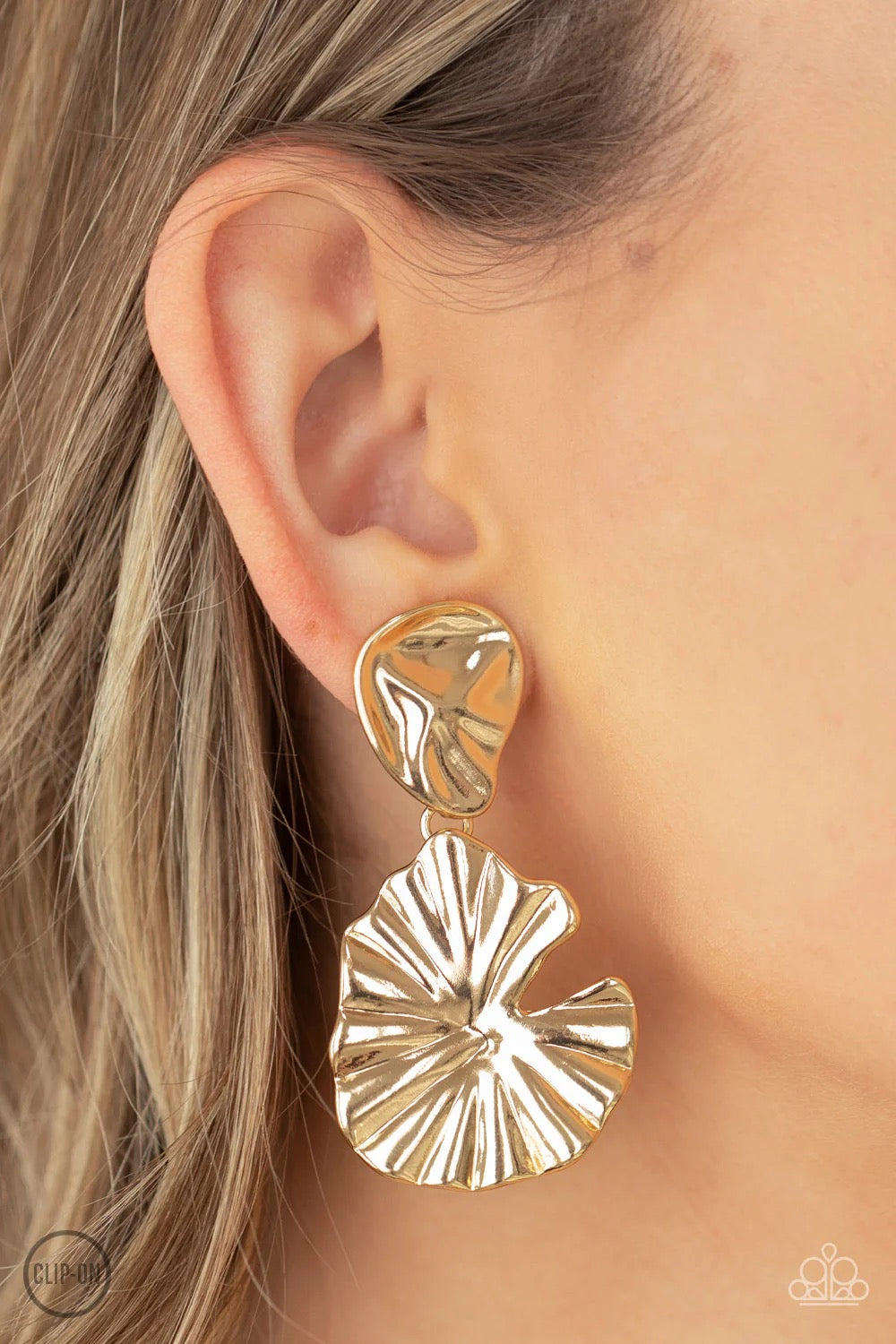 A pair of shiny gold jungle leaves - one small, one large - fan out and dangle from the ear for a powerful Amazonian vibe. Earring attaches to a standard clip-on fitting.