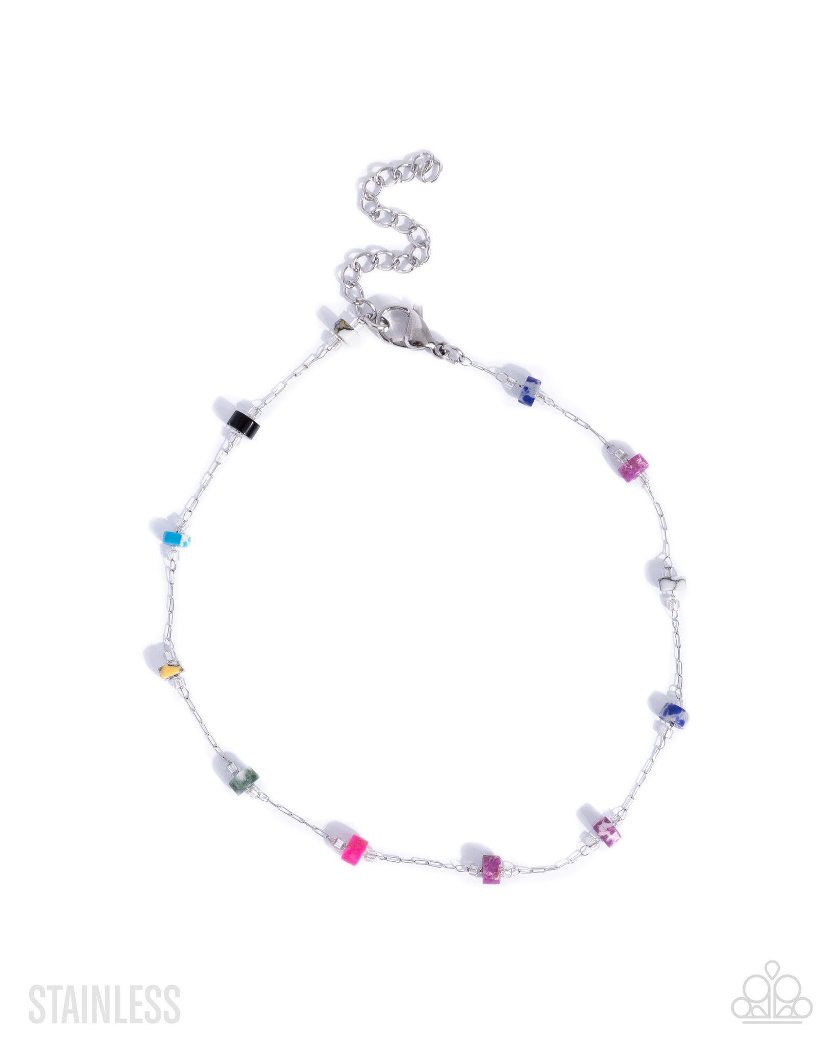Embellished along a dainty stainless steel chain, a collection of multicolored, dainty stone discs encircles the ankle for an eclectically earthy display. Features an adjustable clasp closure. As the stone elements in this piece are natural, some color variation is normal.