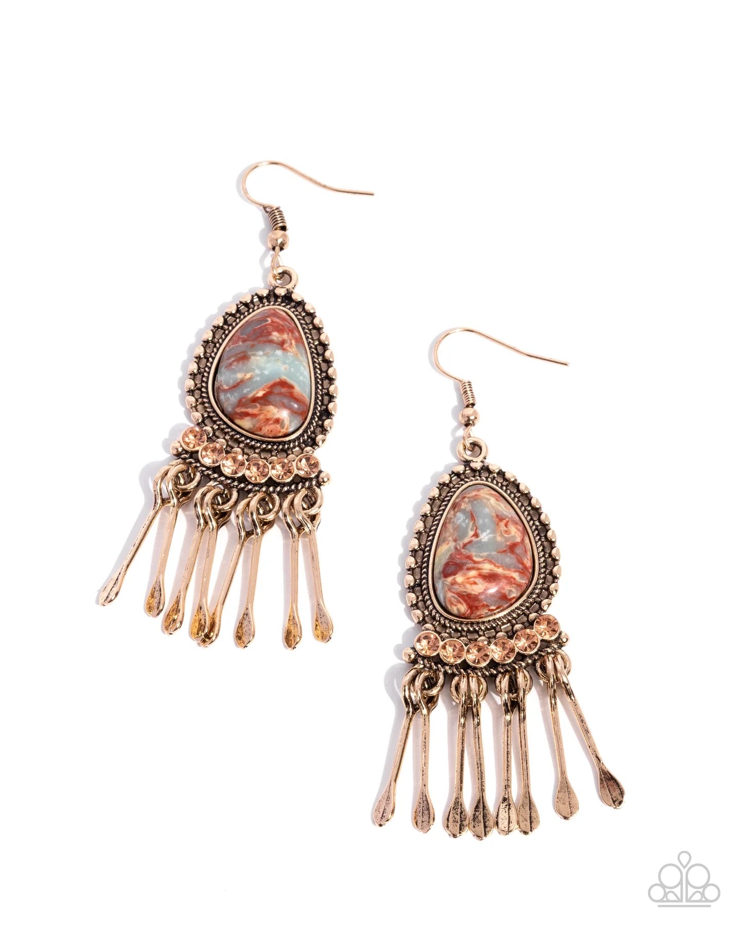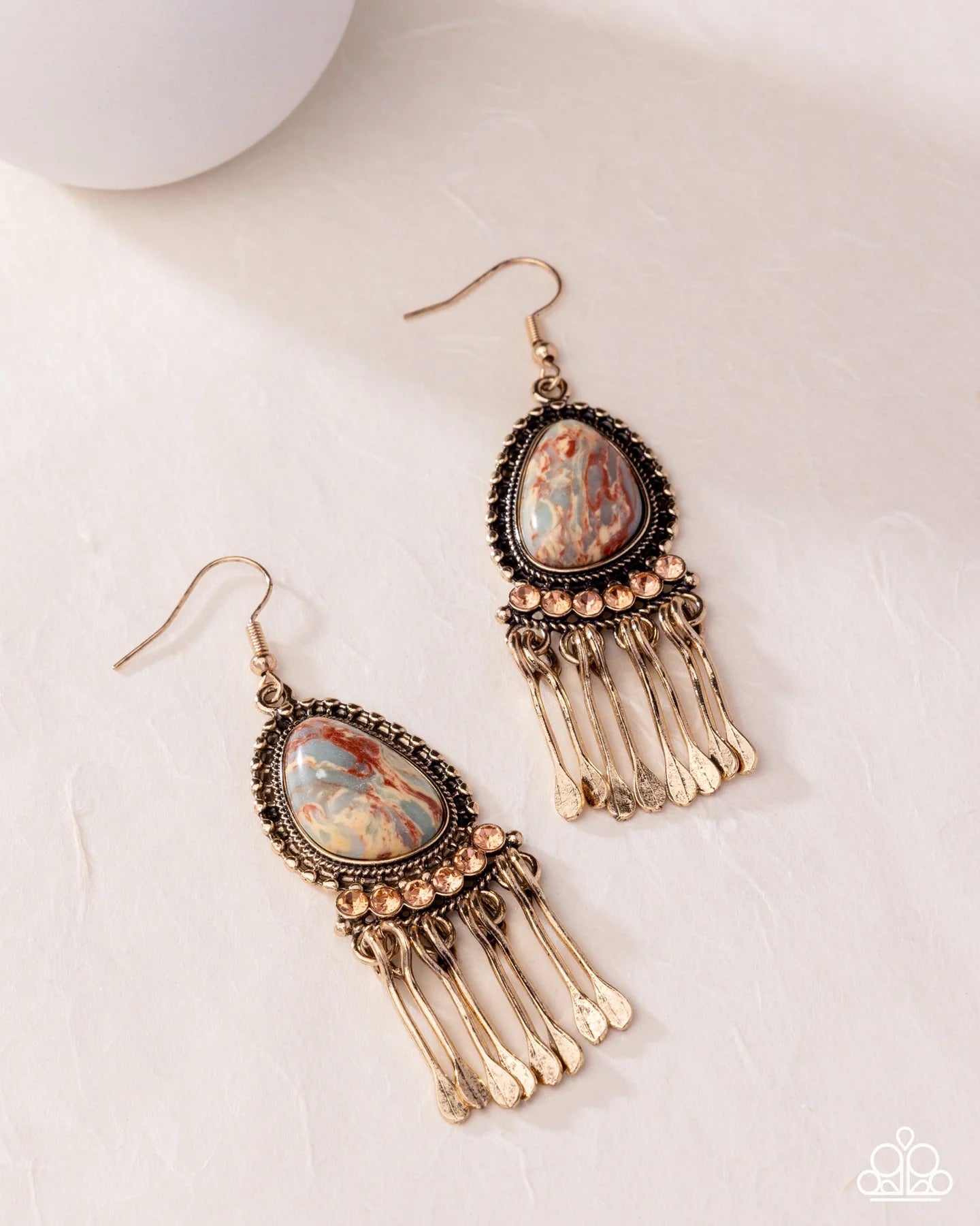 Pressed in a layered, gold-studded frame, an abstract Chili Oil-swirled stone stands out below the ear where a row of light peach rhinestones crowns a twist of gold texture, giving way to duos of flared gold bars for a mighty pop of color and eye-catching detail. Earring attaches to a standard fishhook fitting. As the stone elements in this piece are natural, some color variation is normal.