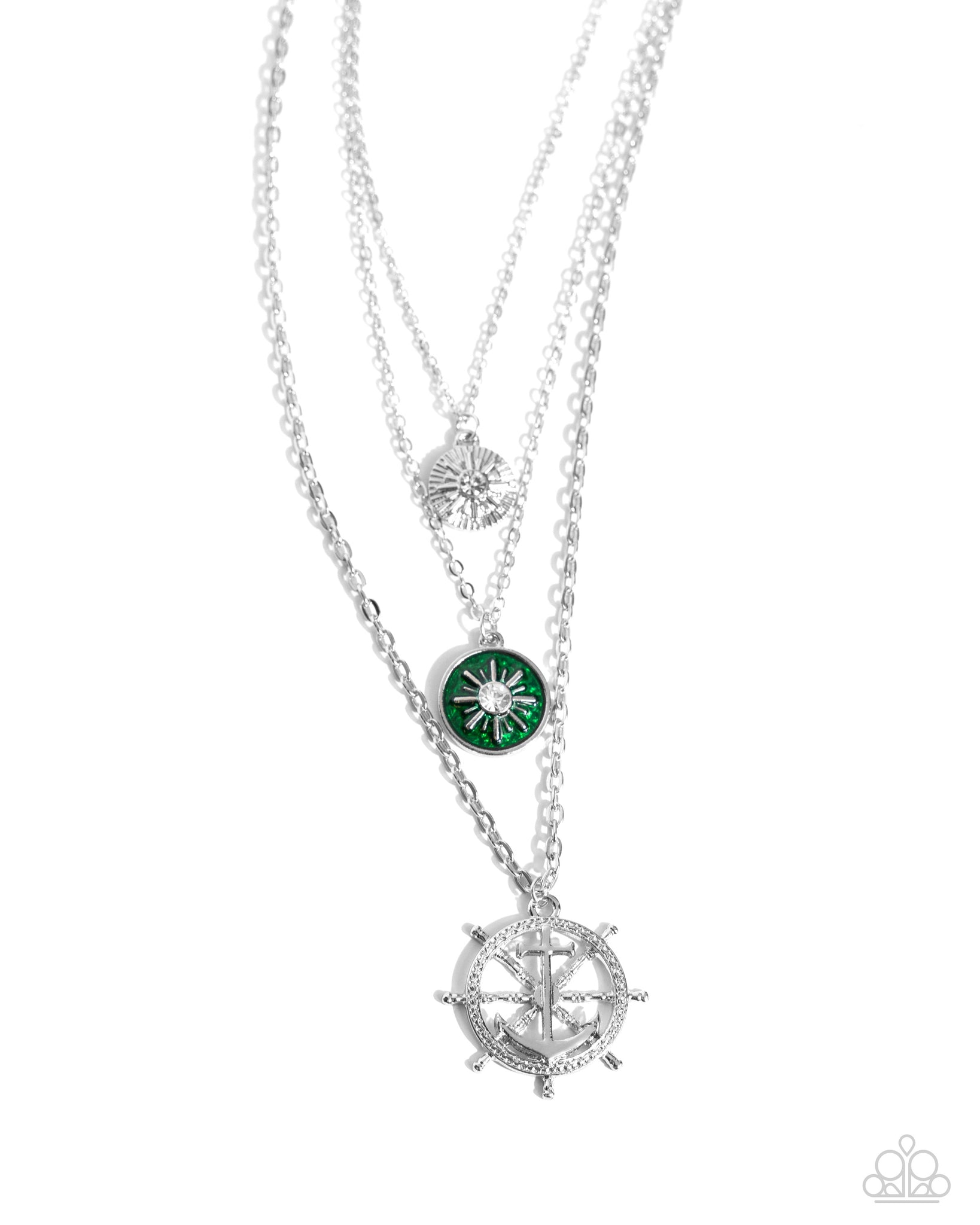 Infused with three coastal pendants, three shimmery silver chains layer across the chest. A textured silver compass charm swings from the uppermost chain above a white gem-centered, silver sunburst charm that glistens from a Mint backdrop. An oversized textured silver disc featuring an anchor and ship's wheel glistens from the lowermost chain for a wanderlust vibe.