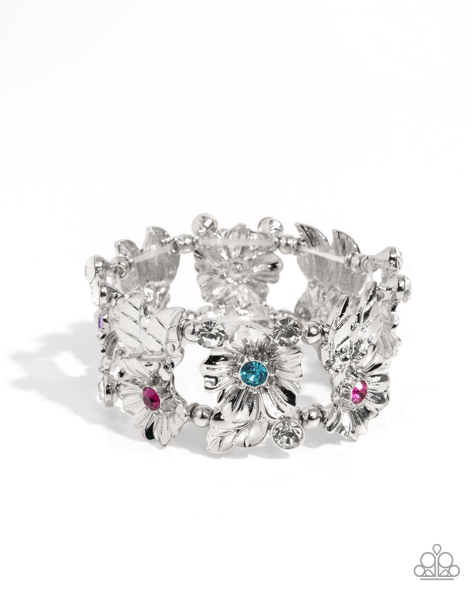 Shimmery multicolored rhinestones in varying sizes dot and create the centerpieces of shimmery luminescent silver flower centerpieces beside textured silver leaves and silver beads for dizzying, intricate detail. The flourish of florals is threaded whimsically around the wrist on elastic stretchy bands, resulting in an unforgettable statement piece that sparkles with sentiment.