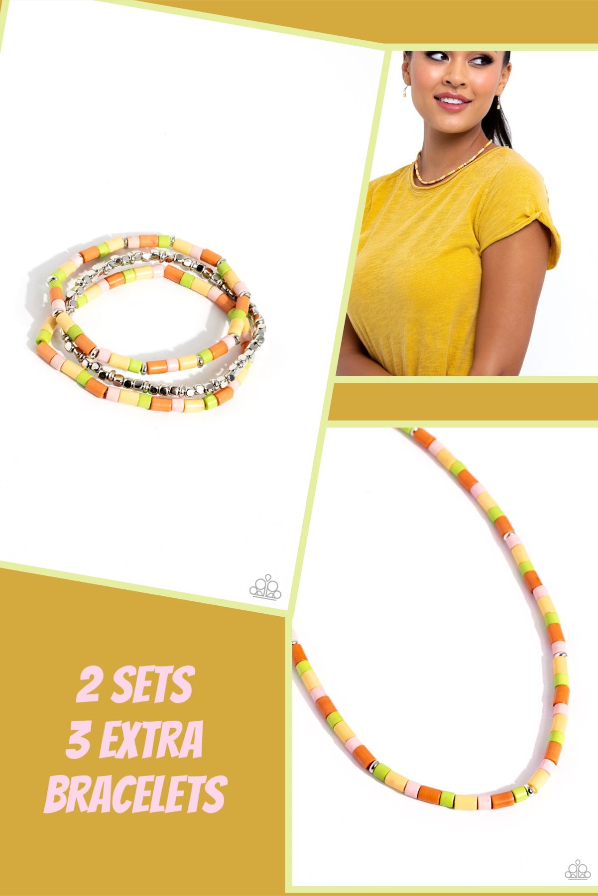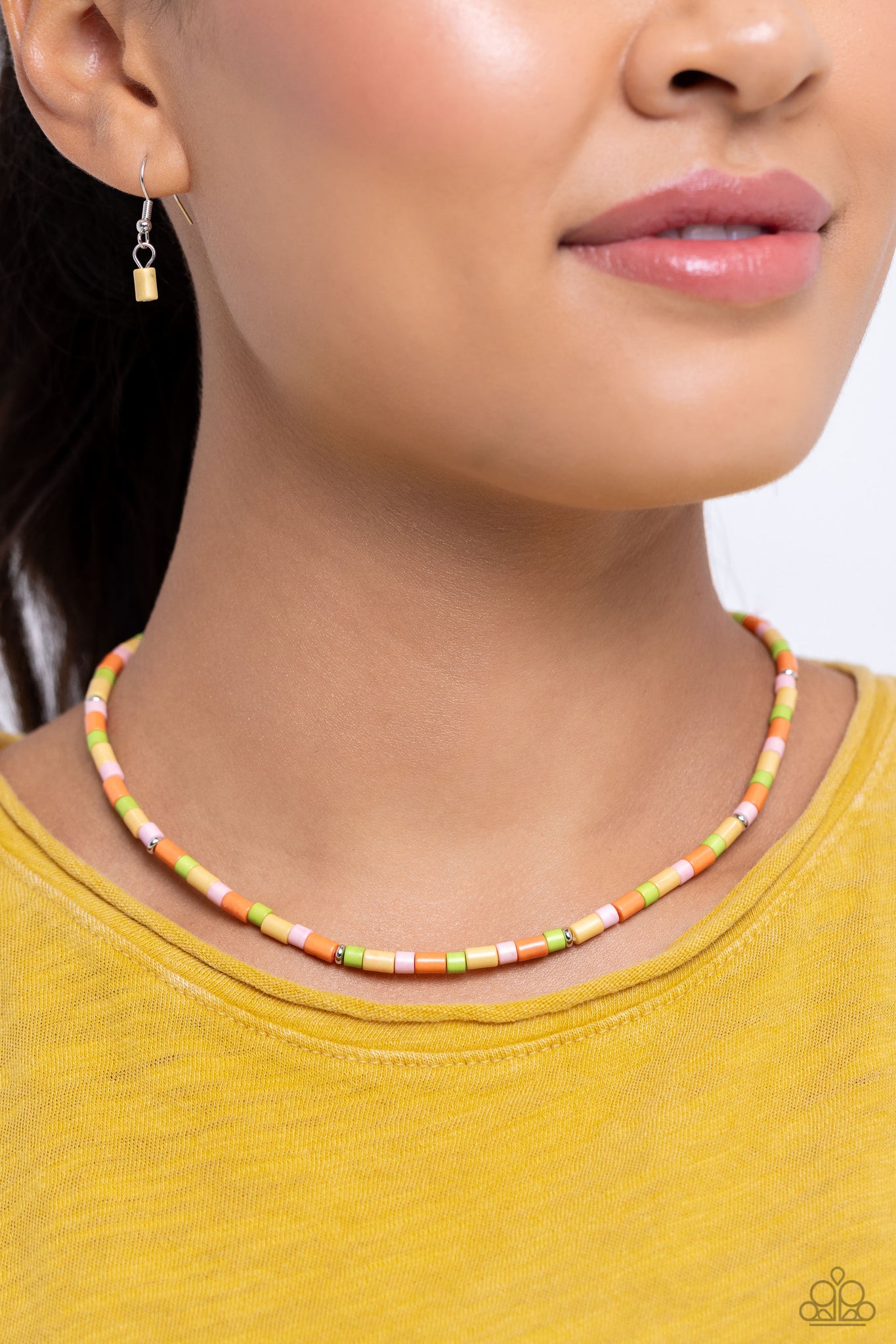 Infused along an invisible string, Kohlrabi, Crystal Rose, yellow, and orange cylindrical stone beads, sporadically dotted with silver accents, wrap around the neckline, creating an all-natural statement. Features an adjustable clasp closure.