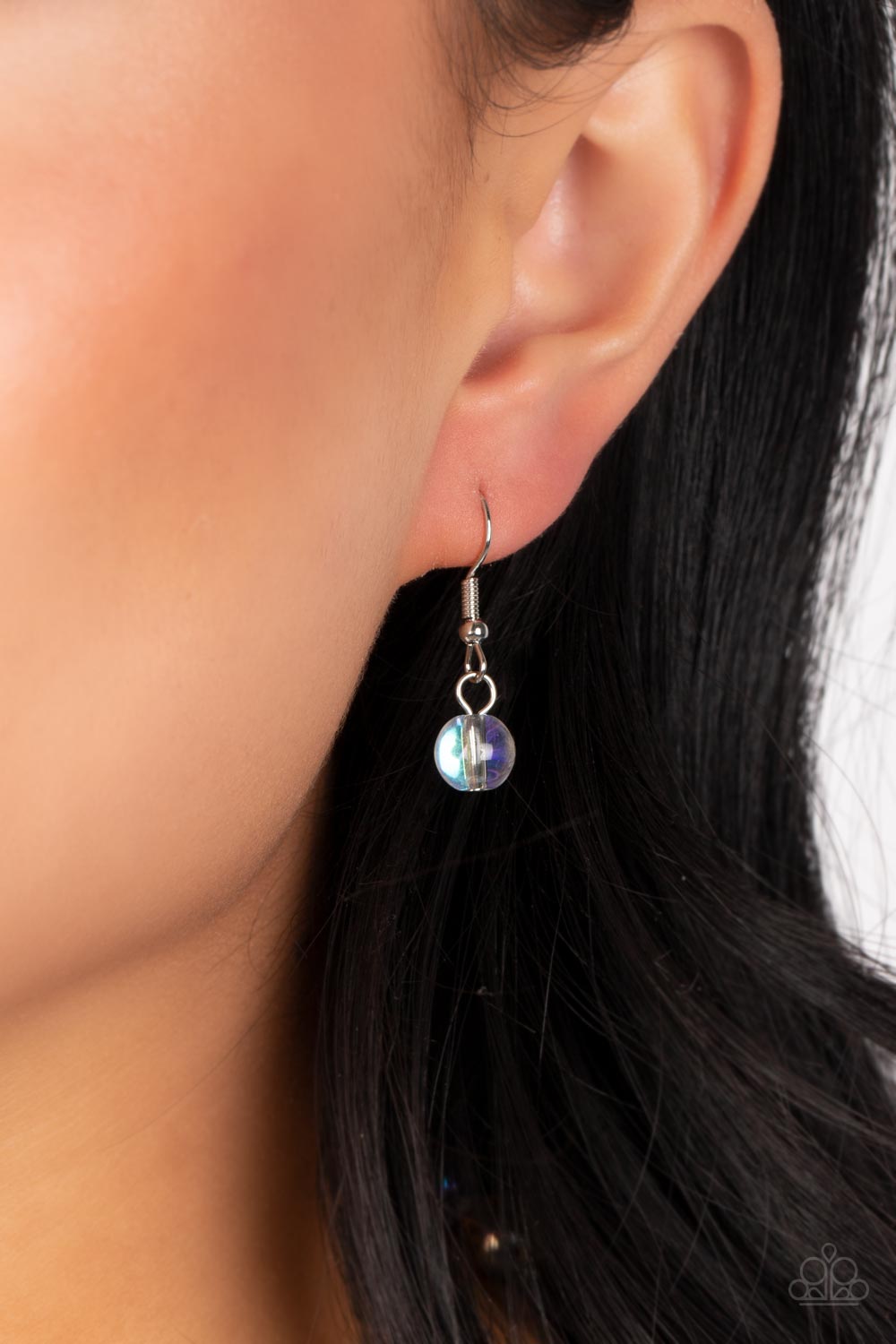 Glassy, orange and iridescent beads sporadically dot two strands of skinny wire, creating the illusion of floating spheres falling down the chest. One side of each marble-like bead is dipped in a silver coating, adding a hint of metallic shimmer to the abstract design. Features an adjustable clasp closure. Due to its prismatic palette, color may vary.