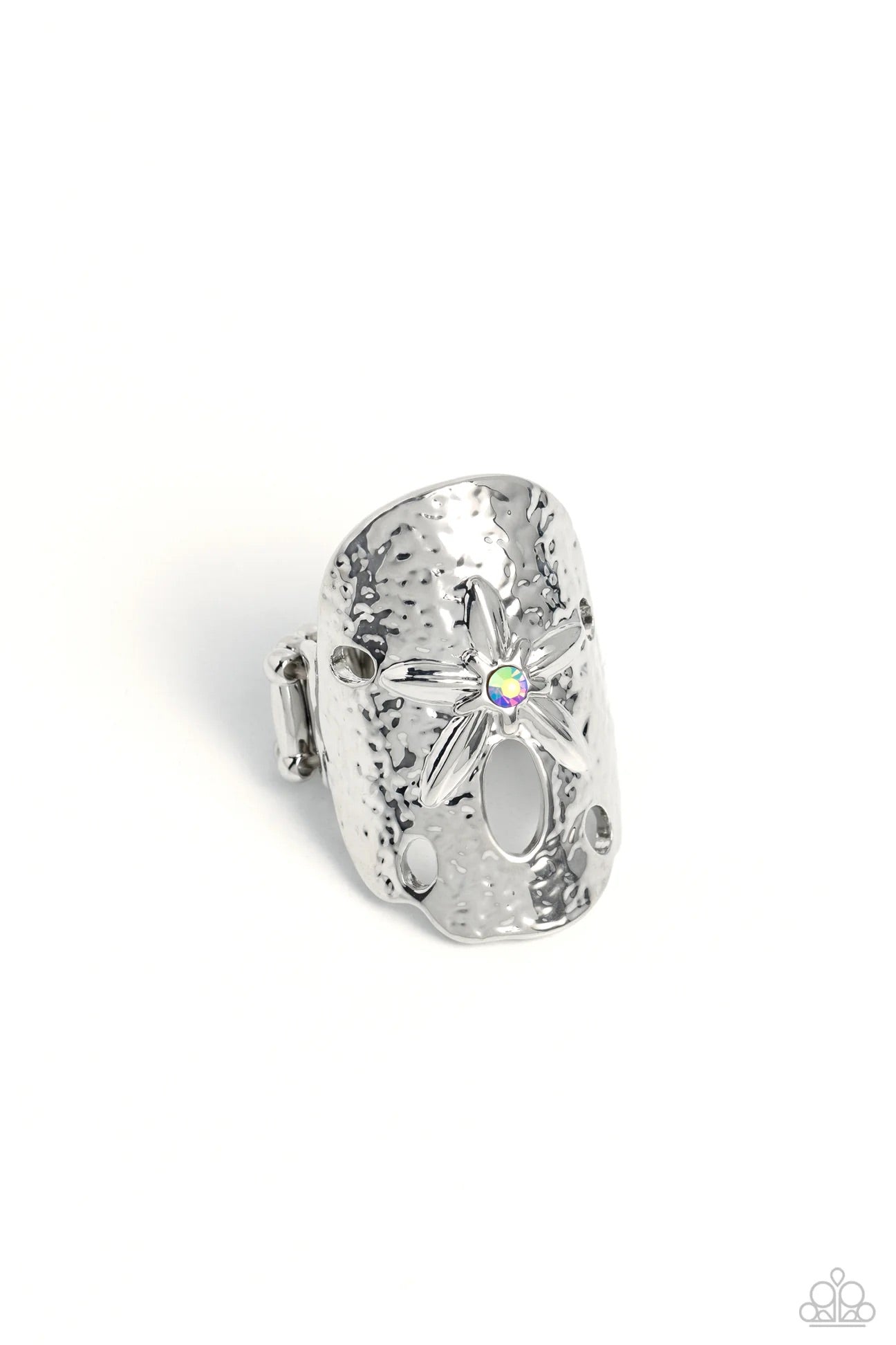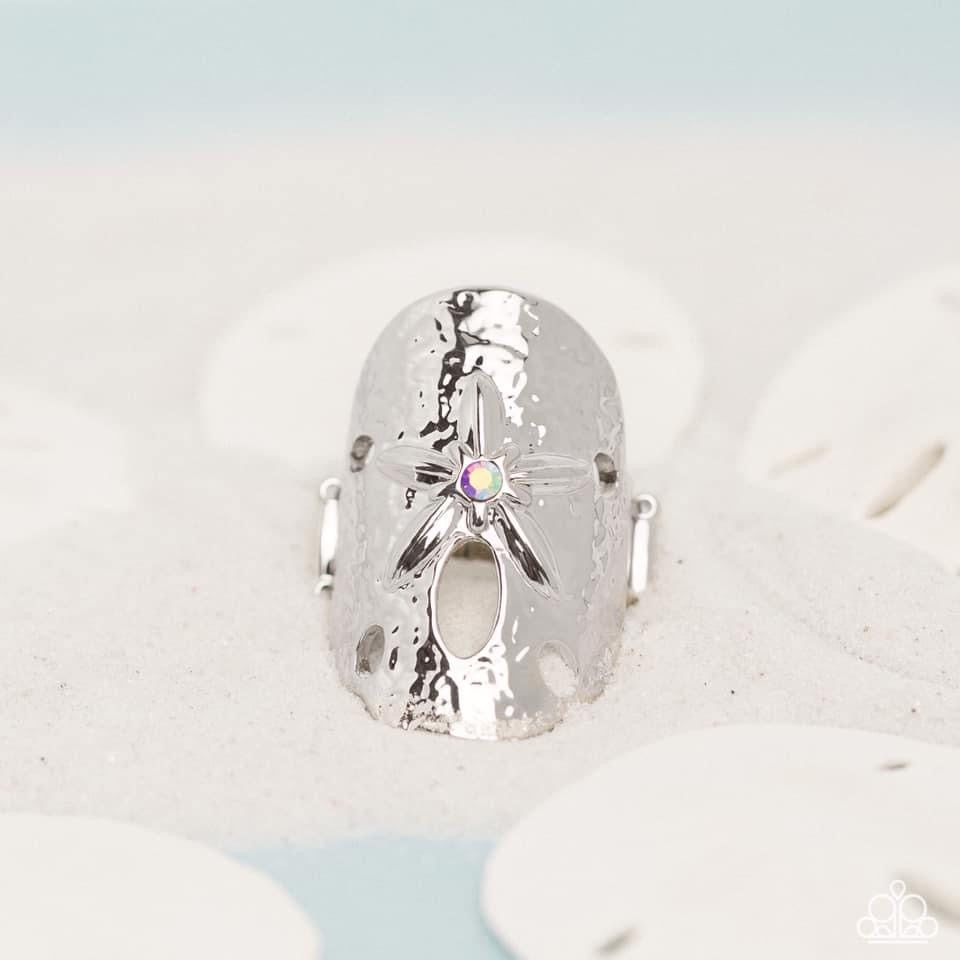 Brushed in a high sheen shimmer and rippling in texture, an oval silver ring, featuring a sand dollar motif and a shimmery orange UV rhinestone, glimmers and shines atop the finger for a beachy centerpiece. Features a stretchy band for a flexible fit.