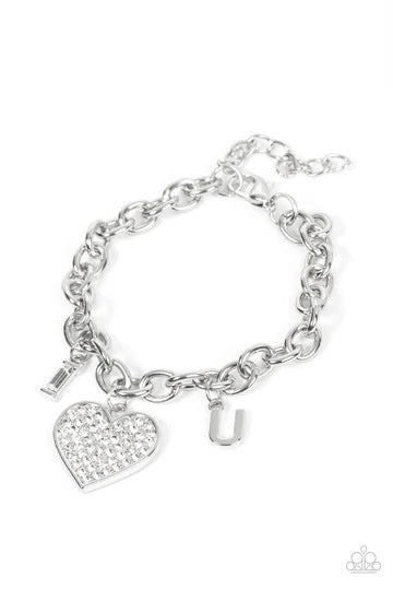 Encrusted with sparkly white rhinestones, an oversized silver heart charm dances between a pair of "I" and "U" charms, resulting in a heartwarming message along a dainty silver chain across the chest. Features an adjustable clasp closure.