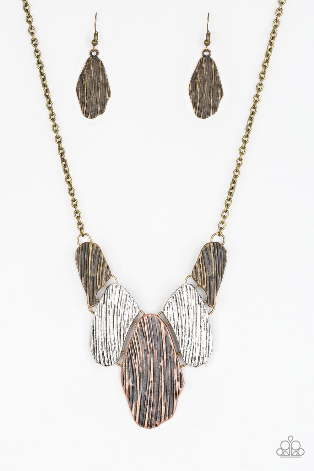 Engraved in antiqued textures, asymmetrical brass, copper, and silver plates link below the collar for an edgy look. Features an adjustable clasp closure.