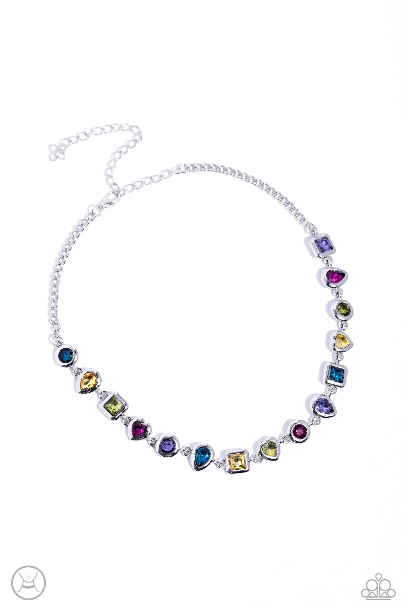 Featuring various shapes and shades, a collection of teardrop, round, heart, and square-cut gems in matching silver frames coalesce around the neckline for an abstract display of color and charm. Features an adjustable clasp closure.