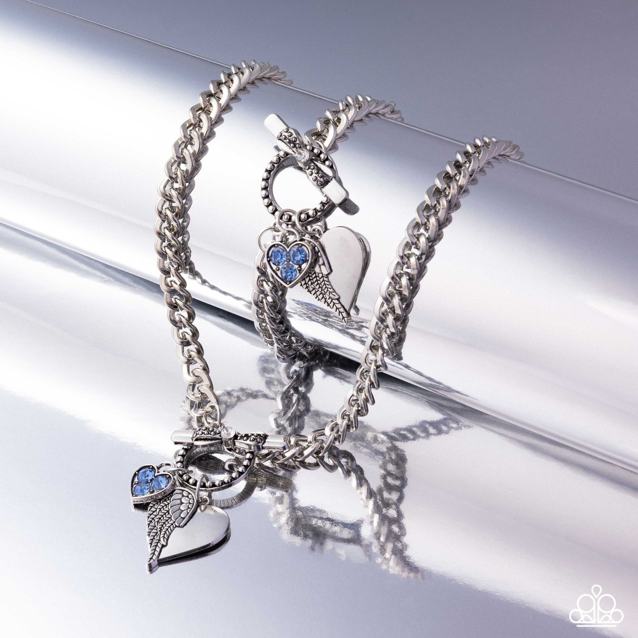Threaded through a studded toggle clasp, a studded and white rhinestone-dotted silver bow, attached to a silver curb chain stands out below the neckline for a radically refined look. Swinging along the studded ring, a dainty silver heart padlock embellished with a trio of light sapphire rhinestones dots across the center beside a half angel wing and half silver heart for an adorably angelic look. Features an adjustable clasp closure.