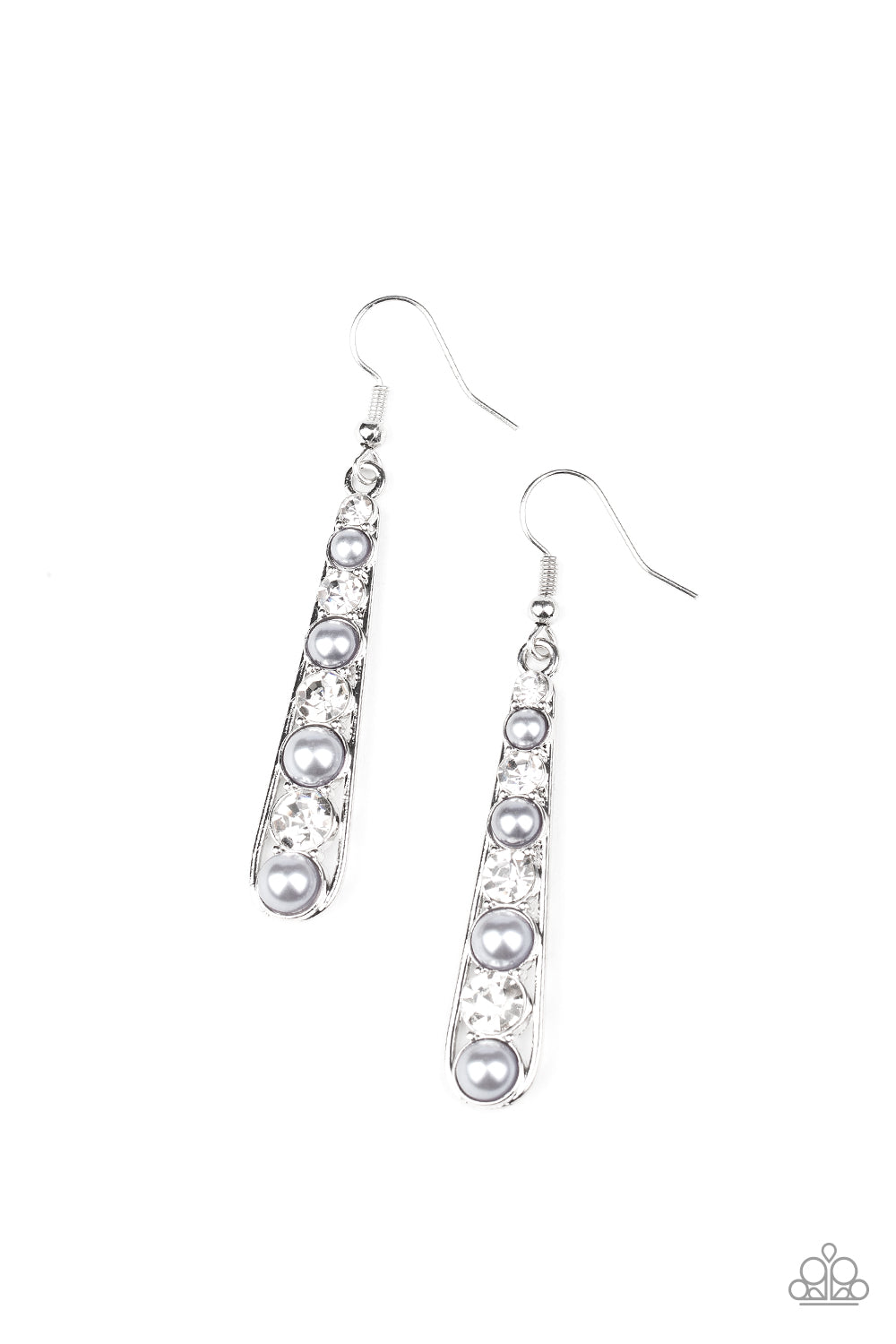 Gradually increasing in size, classic white rhinestones and pearly silver beads alternate across the front of a shimmery silver teardrop frame, creating a refined lure. Earring attaches to a standard fishhook fitting.