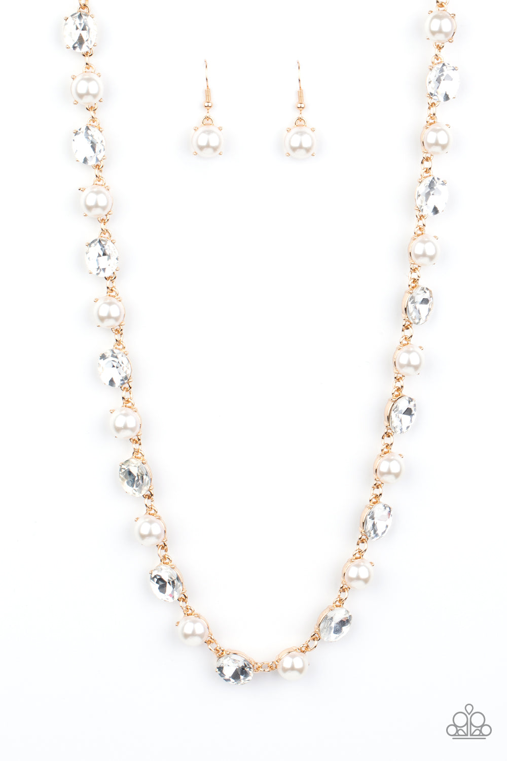 Encased in sleek gold fittings, a classic array of bubbly white pearls and glassy white rhinestones delicately link below the collar in a statement making finish. Features an adjustable clasp closure.