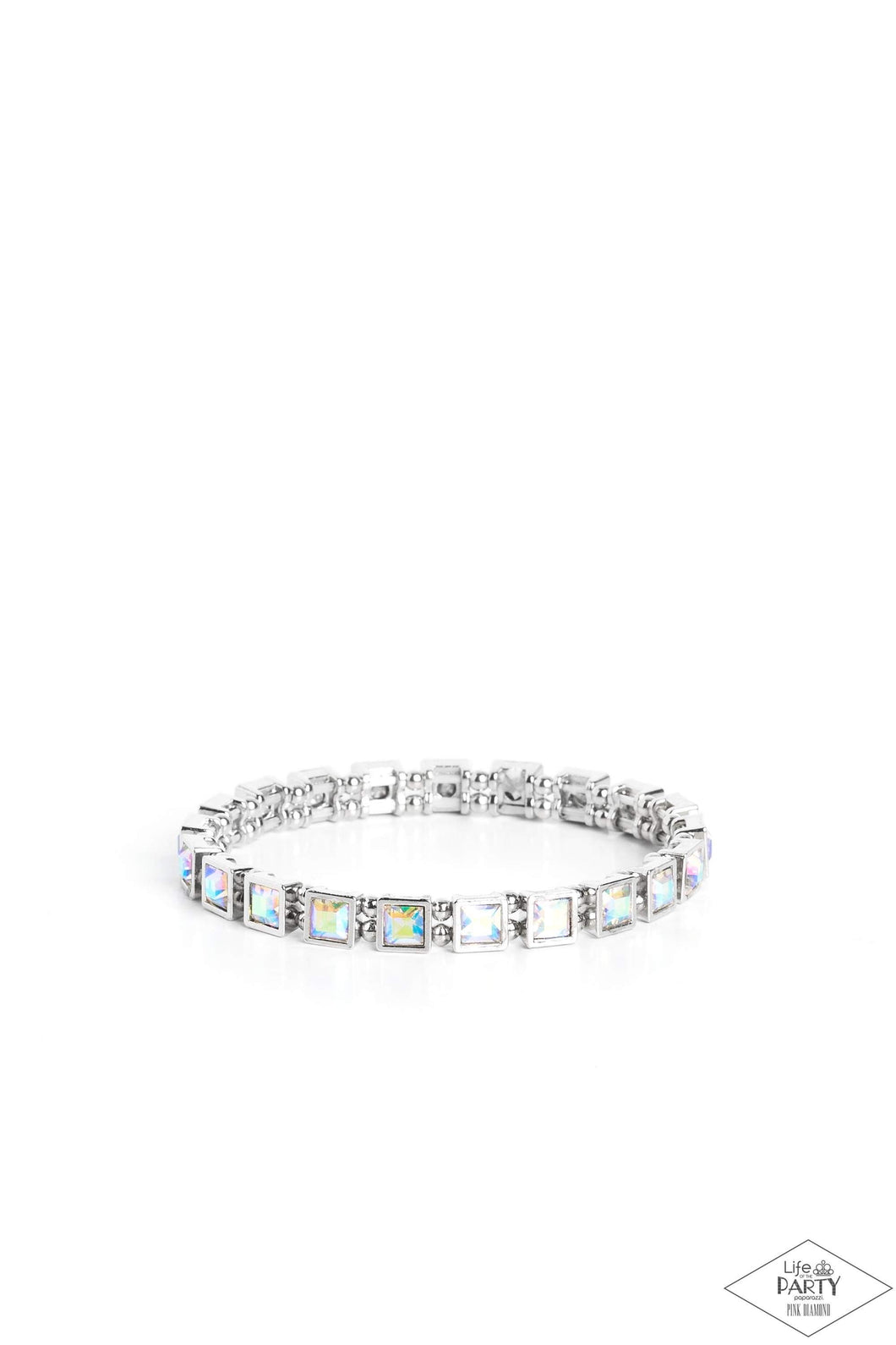 Chiseled into elegant squares, glittery iridescent gems are nestled into sleek silver frames and threaded along elastic stretchy bands for a refined look. Due to its prismatic palette, color may vary.